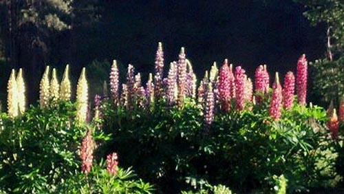 with pea-like flowers in intense blues, reds, pinks and creams. These