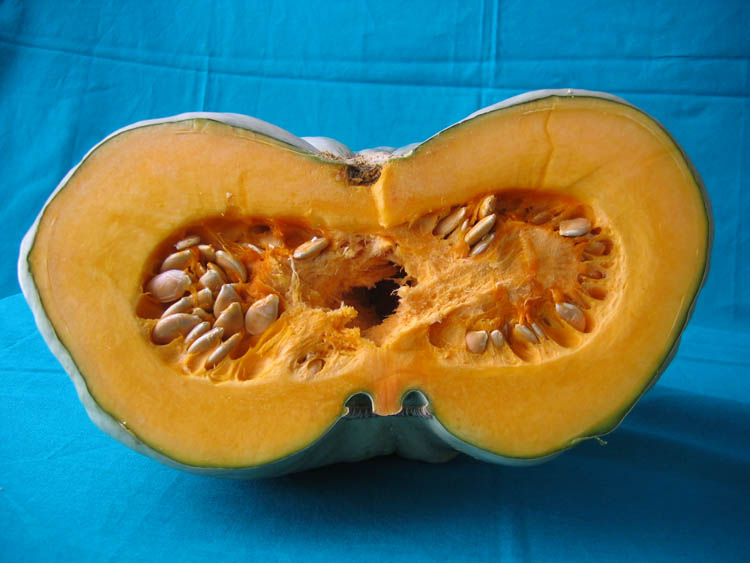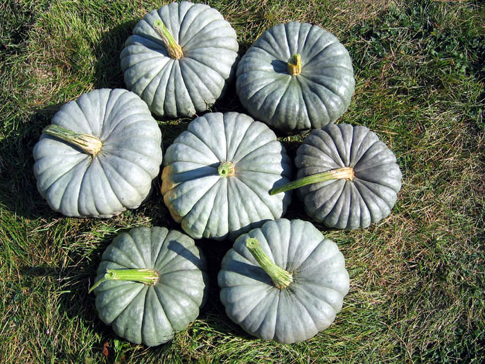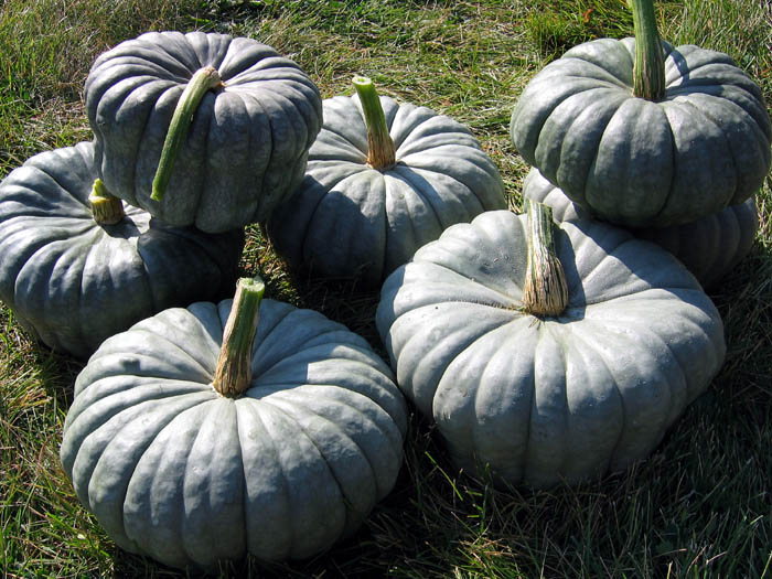 This squash has a striking gray blue skin, flattened in shape and